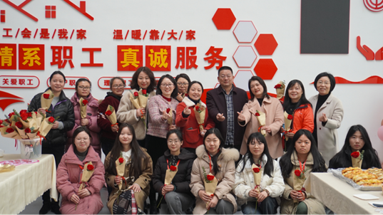 学院党委书记袁光敏代表我院行政领导班子向女教师们献上鲜花,团委学生干部也积极参与其中并送上祝福。女教师们共同品尝美食、分享快乐,现场气氛即轻松愉悦又温馨暖人。