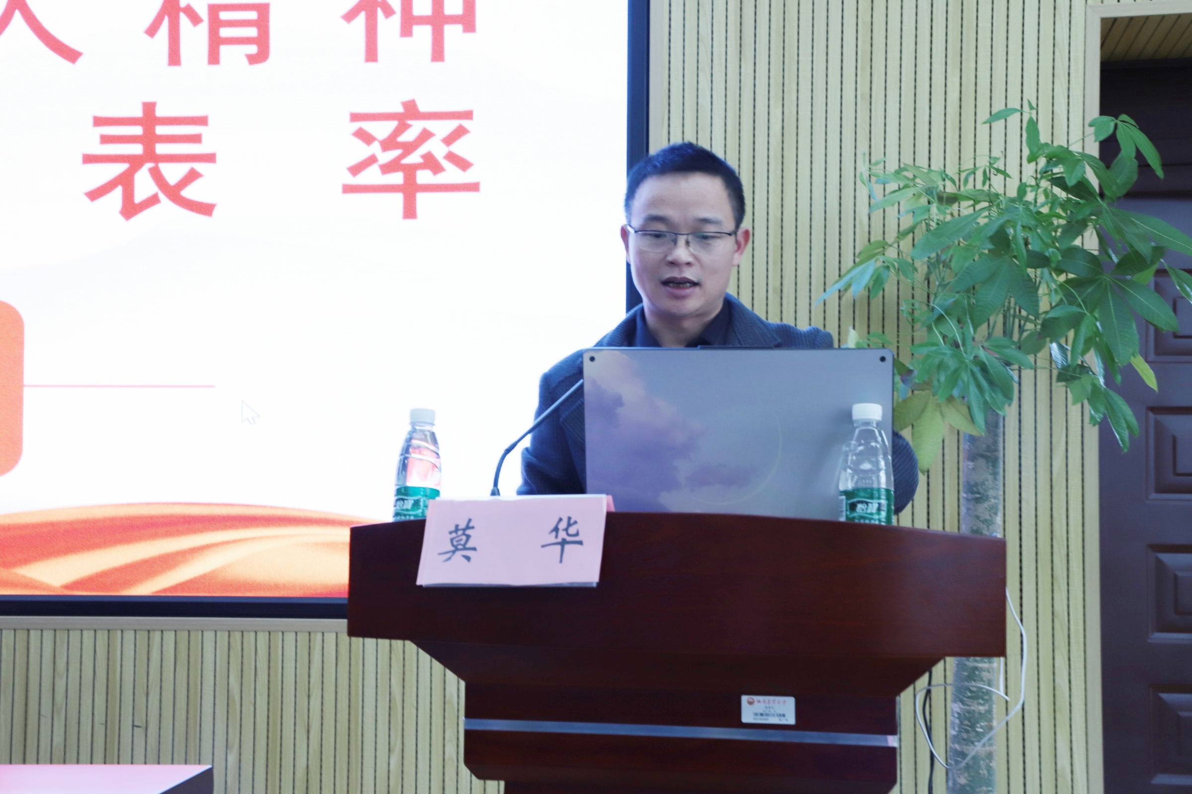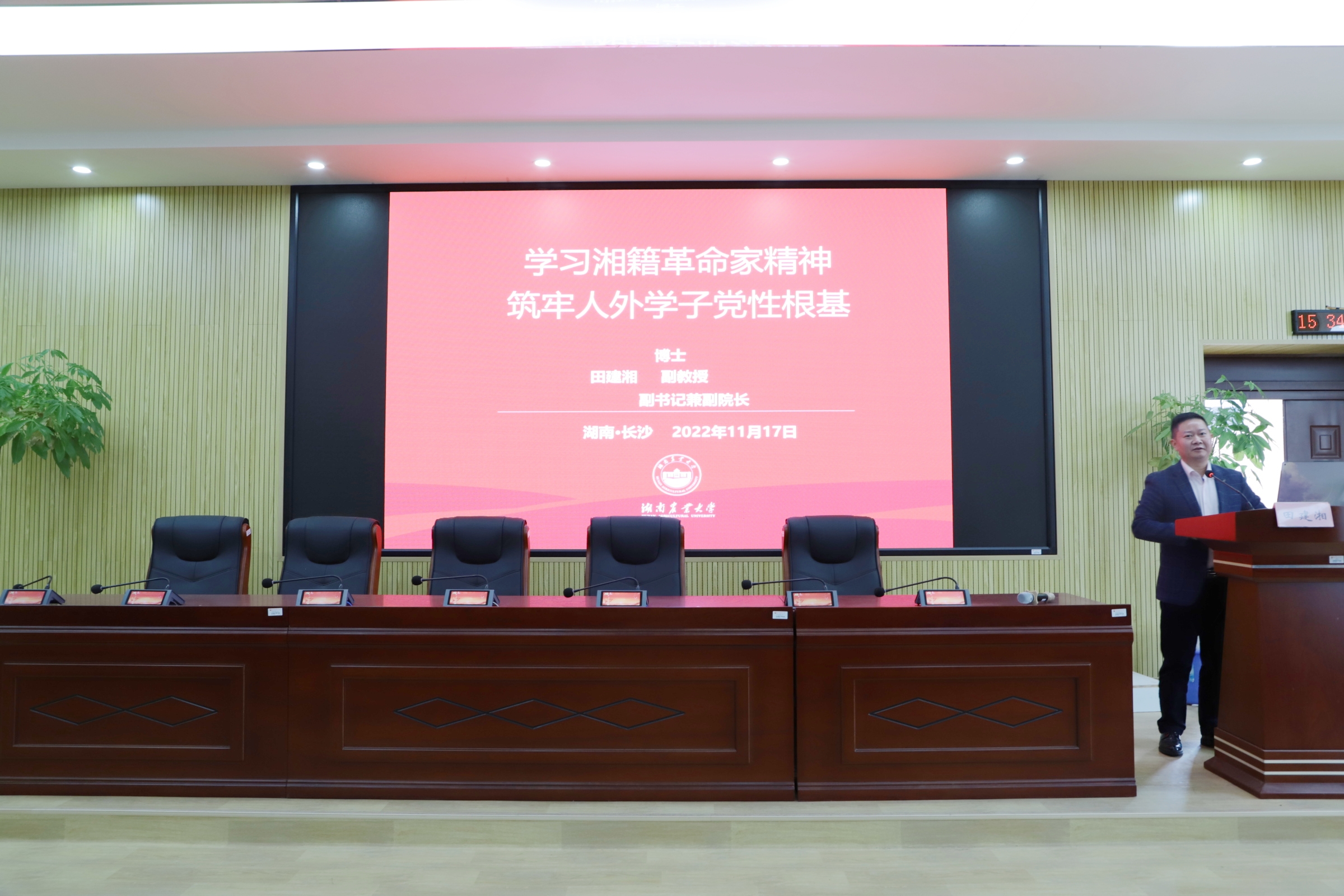 学院党委副书记田建湘党课宣讲以湖湘诞生的一系列革命伟人讲起,提出湖湘文化造就人才,引用杨度《湖南少年歌》的一句“若道中华国果亡,除非湖南人尽死”,道出了历史上湖南人才辈出。湖湘文化不仅造就伟人,而更多是一种精神激励与传递,它鼓励着大学生党员要不断学习湘籍革命家的顽强、坚忍,不断踔厉奋发,向着新时代迈进。