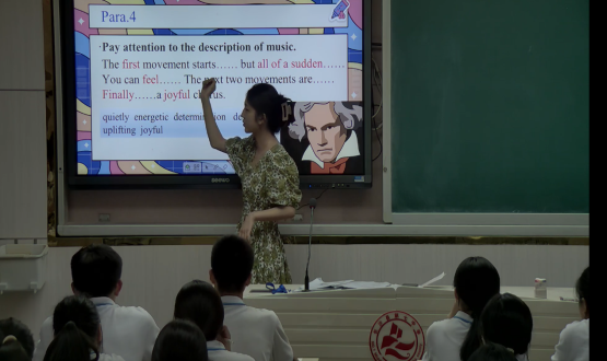 易思彤同学授课的单元是高二年级的The Universal Language,她以问题作引入,通过先学的阅读技巧一步一步引导,先泛后精,再引出问题让同学们深入思考。在教学过程中,她从容淡定,娓娓道来,一举一动,颇具教师风范。