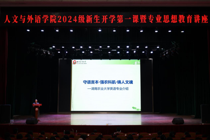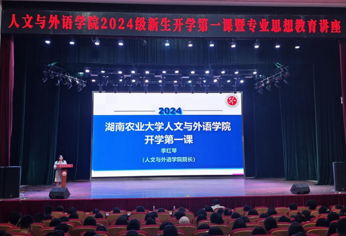 (本网讯 人文与外语学院 彭阳)9月12日,人文与外语学院2024级新生开学第一课暨专业思想教育与爱农教育讲座在大礼堂举行。学院院长季红琴、党委书记袁光敏、副院长范丽群、副院长周芬芬、党委副书记兼副院长刘燕娟出席,2024级研究生班主任刘姿妤、2024级本科生新生辅导员彭阳、学工办主任曾葵华、2024级全体新生以及新生助班500余人参加,讲座由刘燕娟主持。