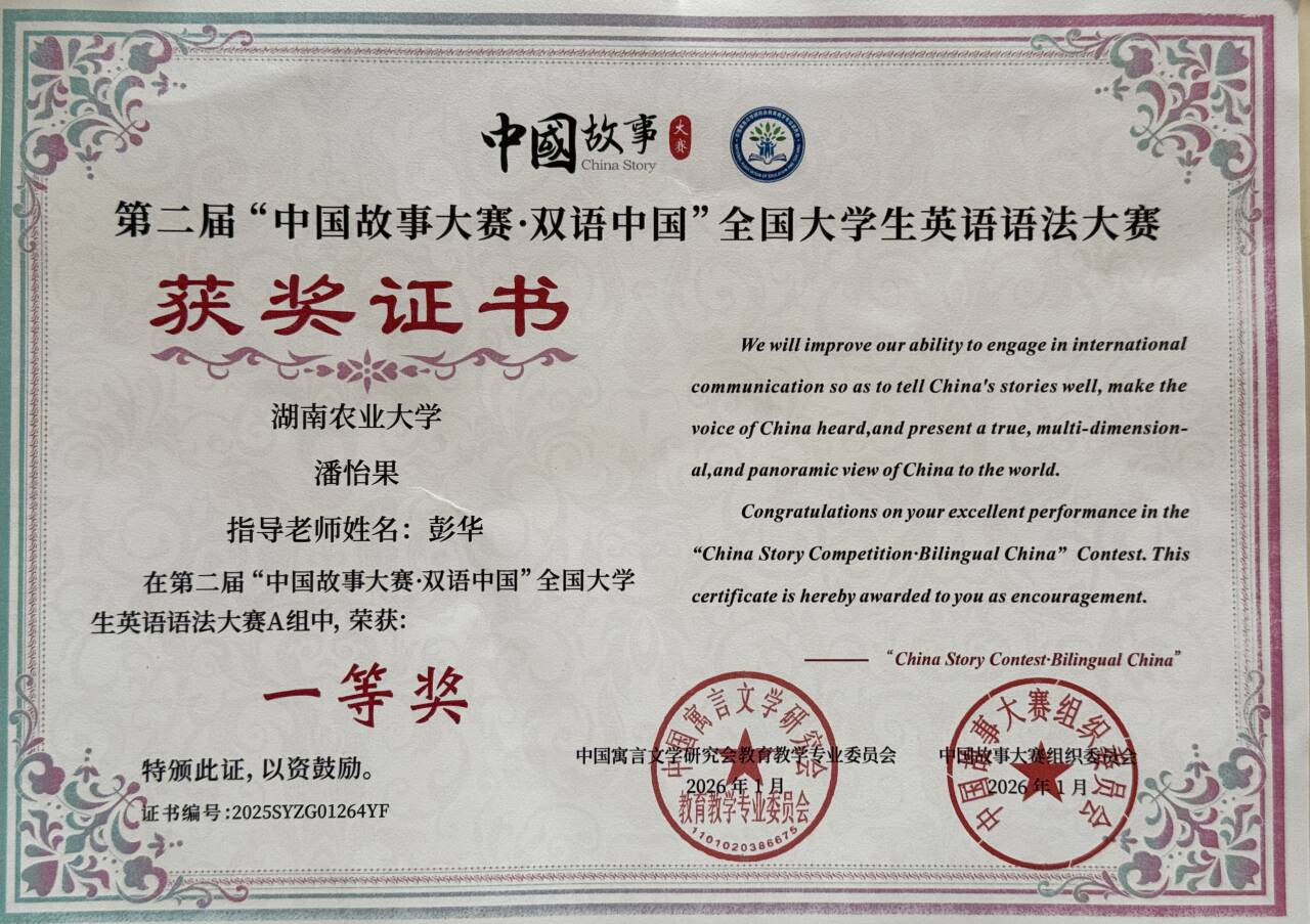 近日,第二届“中国故事大赛·双语中国”全国大学生英语语法大赛成绩公布,人文与外语学院2025级英语9班潘怡果同学(指导老师彭华)在第二轮比赛中获英语专业组(A组)全国一等奖。