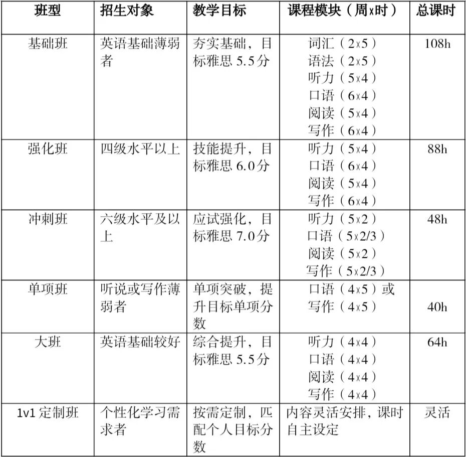 基础班,强化班,冲刺班,单项班,大班,1v1定制班六种班型授课,根据学生需求定制学习方案。