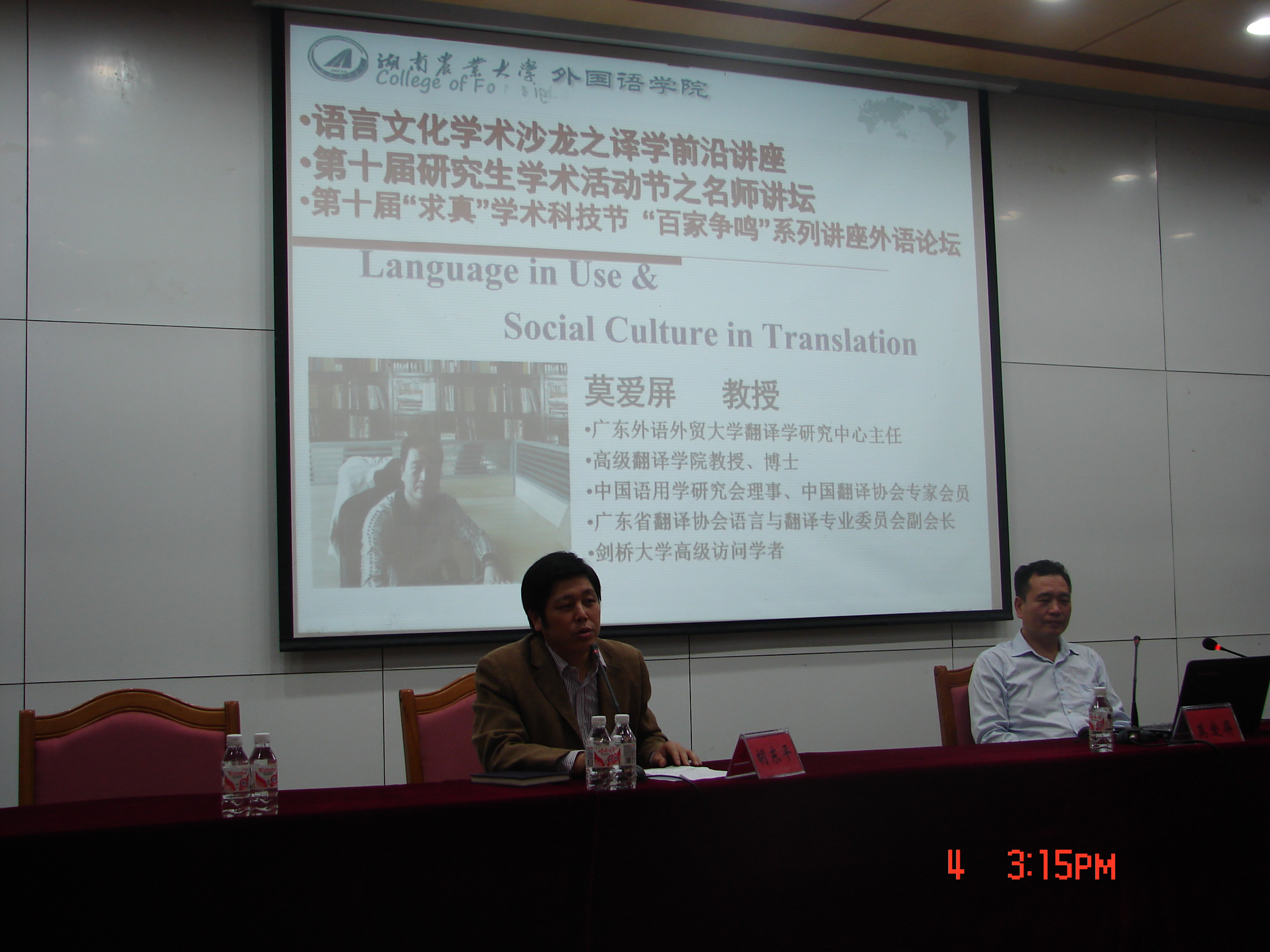 讲座在同学及老师们热烈的掌声中开始,外国语学院胡东平教授对莫教授的到来表示热烈的欢迎,同时希望同学们能从这次讲座中有所获益。莫教授用轻松、幽默的语言为我们讲述了生活中种种翻译误用的现象,并用丰富的语料从语用和社会文化的角度阐述了他对语言翻译的理解,引起大家对翻译实践中语境和文化因素的重视,同时也让大家充分领略到了语言的魅力和文化交流的必要。讲座之余,莫教授还给大家介绍了广东外语外贸大学的校史,并高度赞扬了湖南农业大学外国语学院近两年向广外输送的硕士推免生,这所历史厚重而又焕发生机的名校引发了同学们无尽的向往,在提问环节,师生们踊跃提问,莫教授幽默而机智的回答,赢得了大家阵阵掌声。
