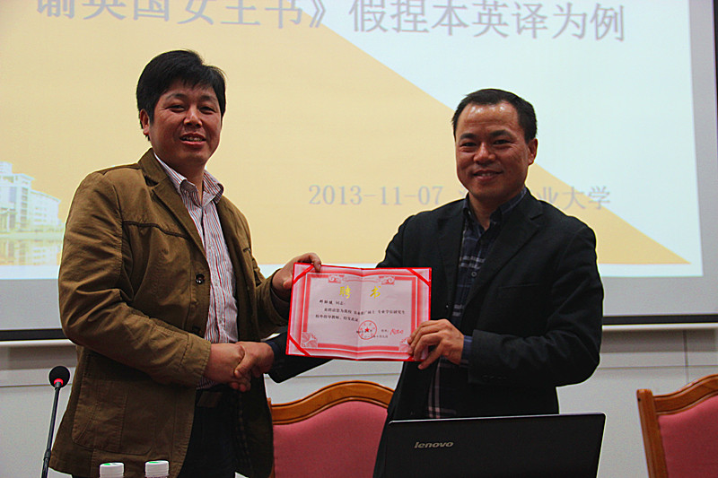 11月7日下午,学海报告厅迎来了教育部大学外语教学指导委员会委员、湖南省大学外语专业委员会副会长、中南林业科技大学外国语学院院长邓联健教授主讲的精彩讲座。讲座由张玉上副院长主持。院长胡东平教授和近200名师生在学海厅听取了讲座。在讲座之前,胡东平院长向邓联健教授颁发了“湖南农业大学专业学位校外研究生指导教师”的聘书。
