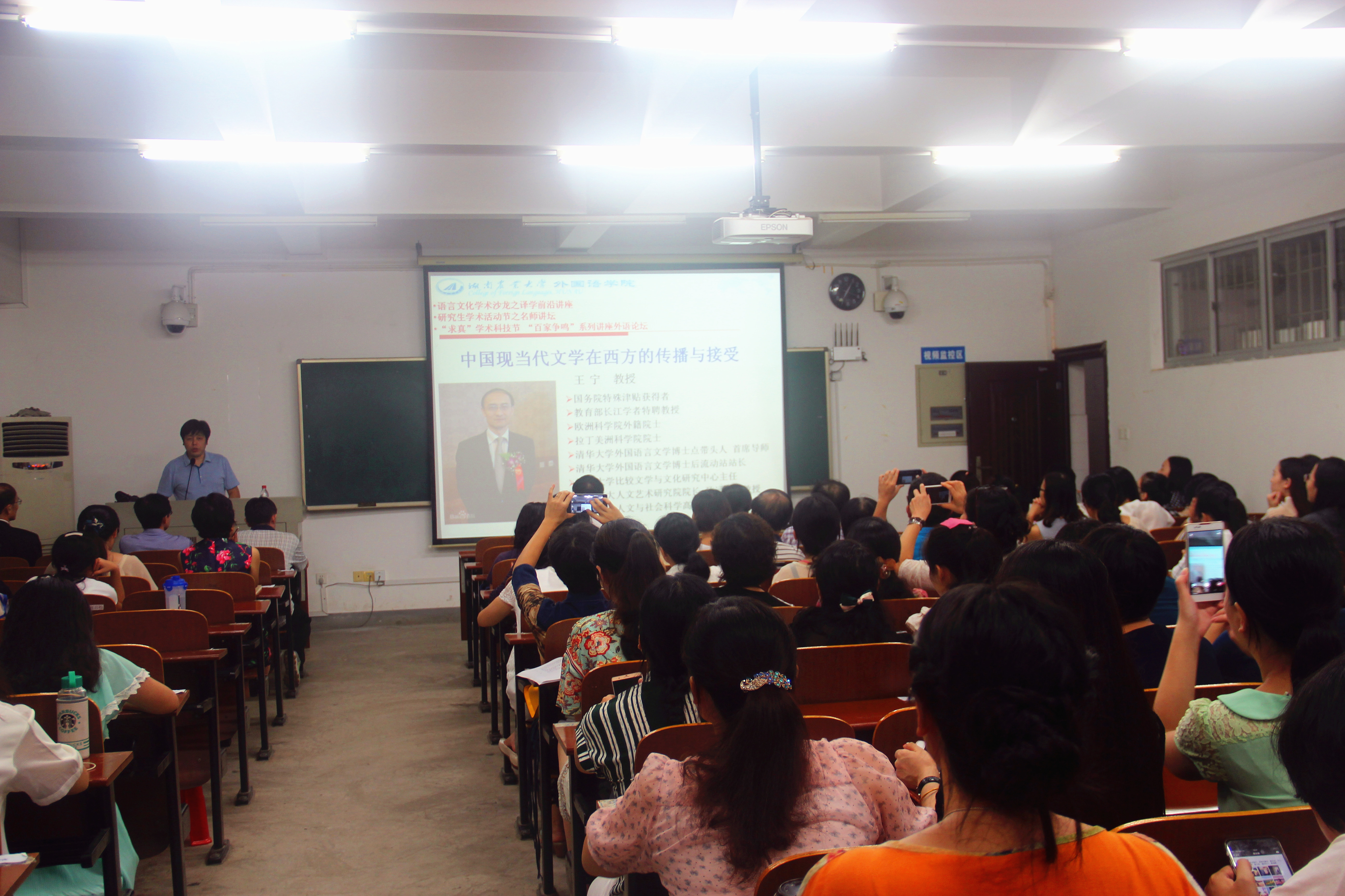 9月24日晚,外国语学院“语言文化学术沙龙”学术前沿讲座、研究生学术活动节名师讲坛以及“求真”大学生学术科技节之“百家争鸣”系列学术科技讲座特邀教育部“长江学者”特聘教授、国务院特殊津贴专家,欧洲科学院外籍院士,清华大学外国语言文学博士点首席导师、比较文学与文化研究中心主任王宁教授来校讲学,讲座主题为“中国现当代文学在西方的传播与接受”。学院院长胡东平教授主持了本次讲座。