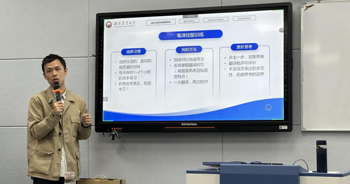 姜启凡老师介绍了翻译硕士的生涯规划,他建议同学们养成每天练习的习惯,找到正确的方法,多鉴赏与思考优秀译文,不断夯实自身,同时也详细讲述了学术论文写作中可能会出现的一些问题并给出了相应的建议。