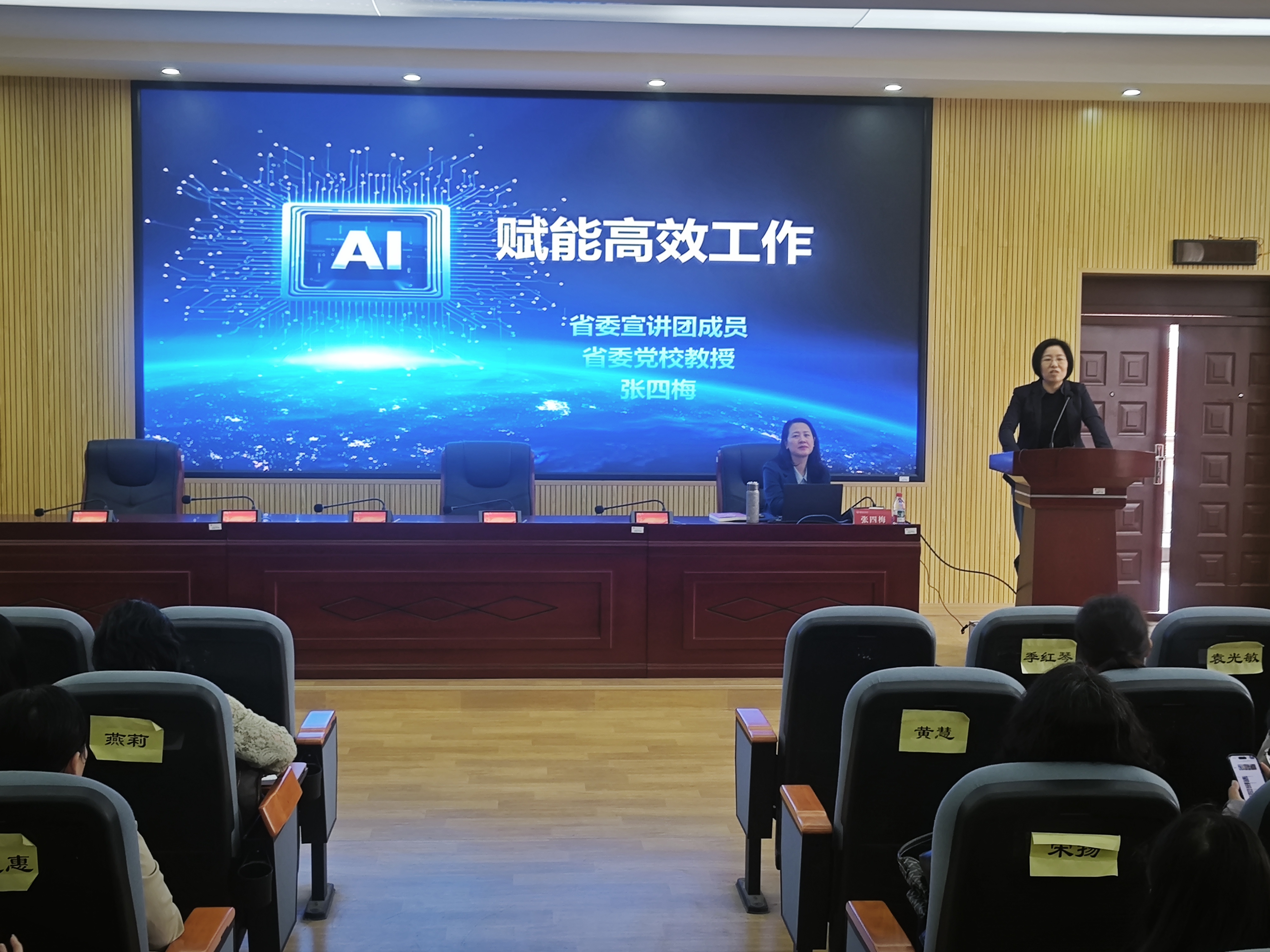 为进一步提升全体师生对人工智能技术的认知水平与应用能力,优化工作效能,4月16日,人文与外语学院在九教南502会议室举办专题学术讲座。本次讲座特邀中共湖南省委宣讲团成员、省委党校张四梅教授主讲,主题为“AI赋能高效工作”。讲座由学院副院长周芬芬主持,百余名师生代表到场聆听,共同开启AI赋能之旅。