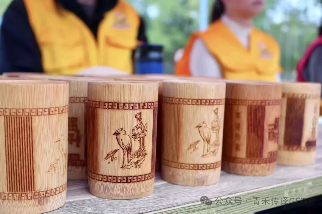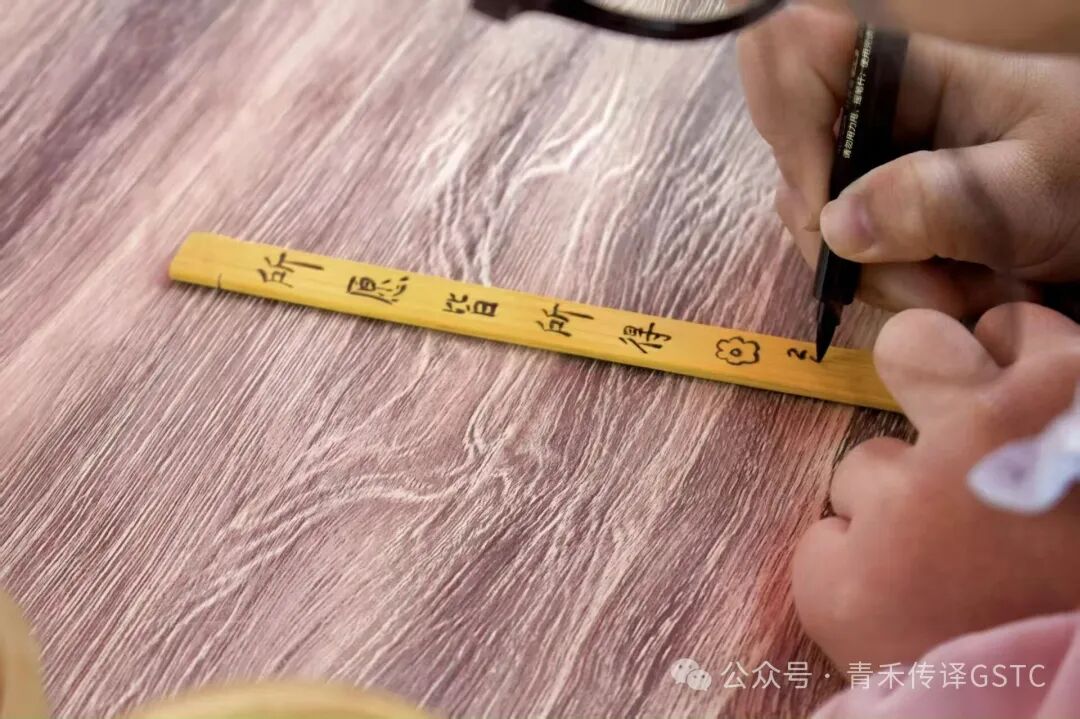 摊位上,竹制小米升静静陈列,筒身绘着精致纹样与书法文字,静待同学们驻足挑选。一旁的简牍竹片则邀请大家提笔书写,在墨痕与竹纹的交错间,亲身触摸古人的书写智慧,不少同学围坐一起体验,笑语里满是新奇与沉醉。