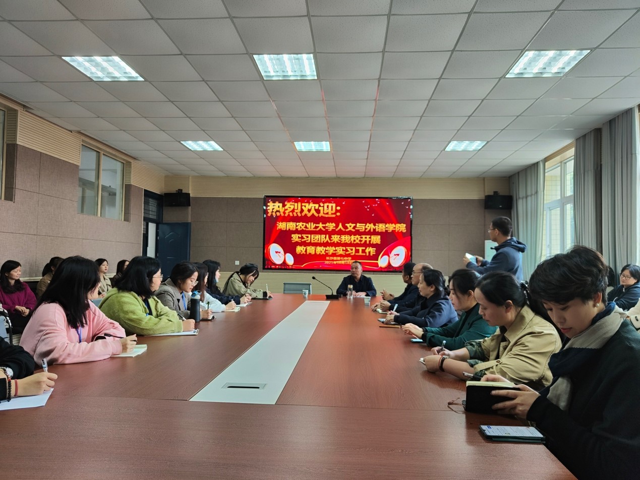 实习团队一行抵达县七中后,带队老师和实习生们参加了七中校方组织的见面暨工作部署会。会议伊始,长沙县七中主管教学的范校长对实习生们的到来表达了热烈的欢迎,范校长介绍了长沙县七中的情况并表达了对实习生们的殷切期盼,希望他们通过实习,收获成长,收获进步,也希望他们以身示范,鼓励并带动学生开口说英语,营造良好的英语学习氛围。
