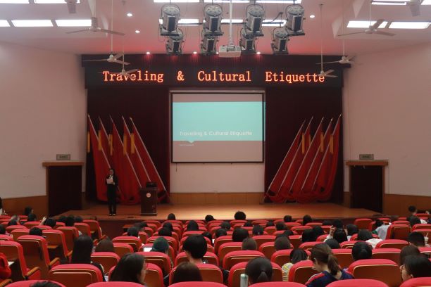 4月22日晚,为拓展学生视野,促进学生学习语言文化,外国语学院于学术报告厅举办了以“Traveling and Cultural Etiquette”为主题的外教讲座。本次讲座的主讲人为外国语学院外教老师Chantelle,17-18级全体英语专业生到场聆听。