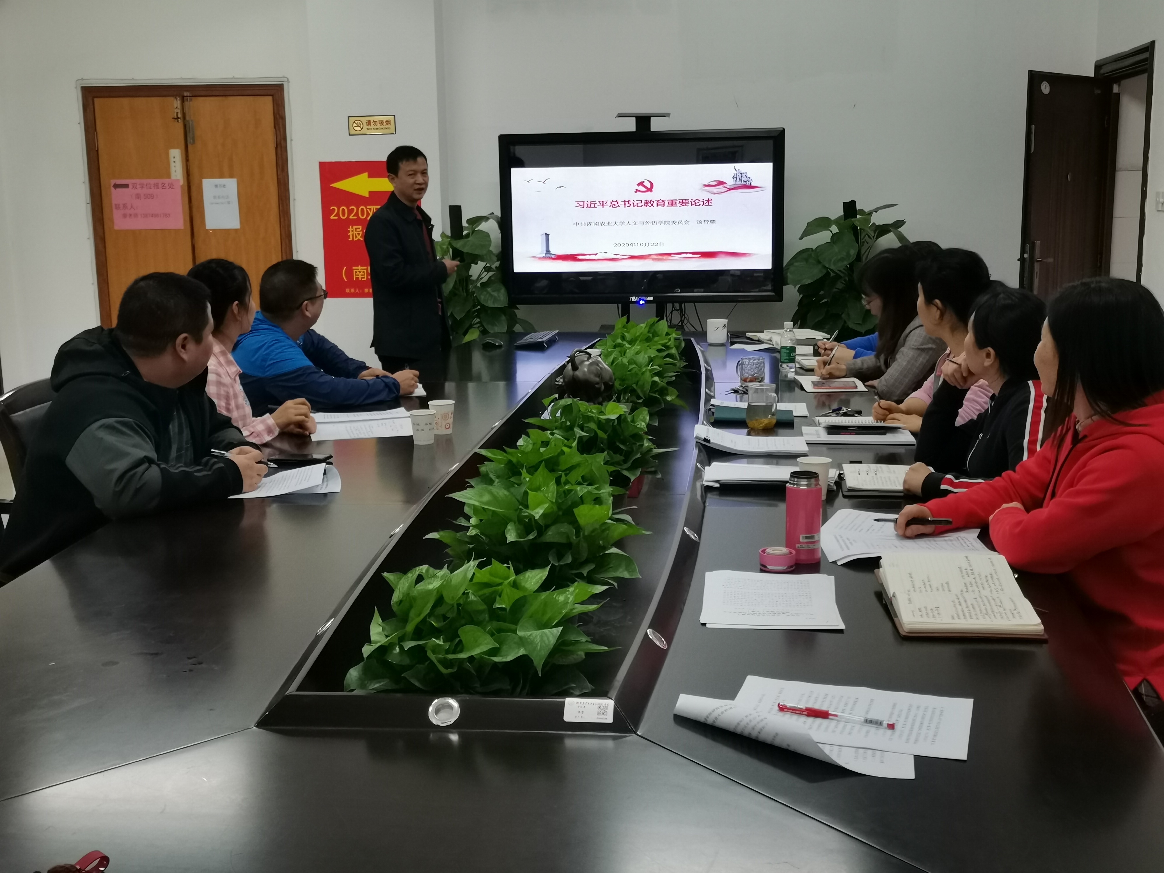 10月22日下午2点30分,人文与外语学院召开“深入学习贯彻习近平总书记考察湖南重要讲话精神,以良好的精神面貌迎接学校第九次党代会召开”专题学习讨论会。会议由院党委书记林丽娅主持,学院全体党委委员参加学习讨论,易自立副校长出席会议并进行了指导。