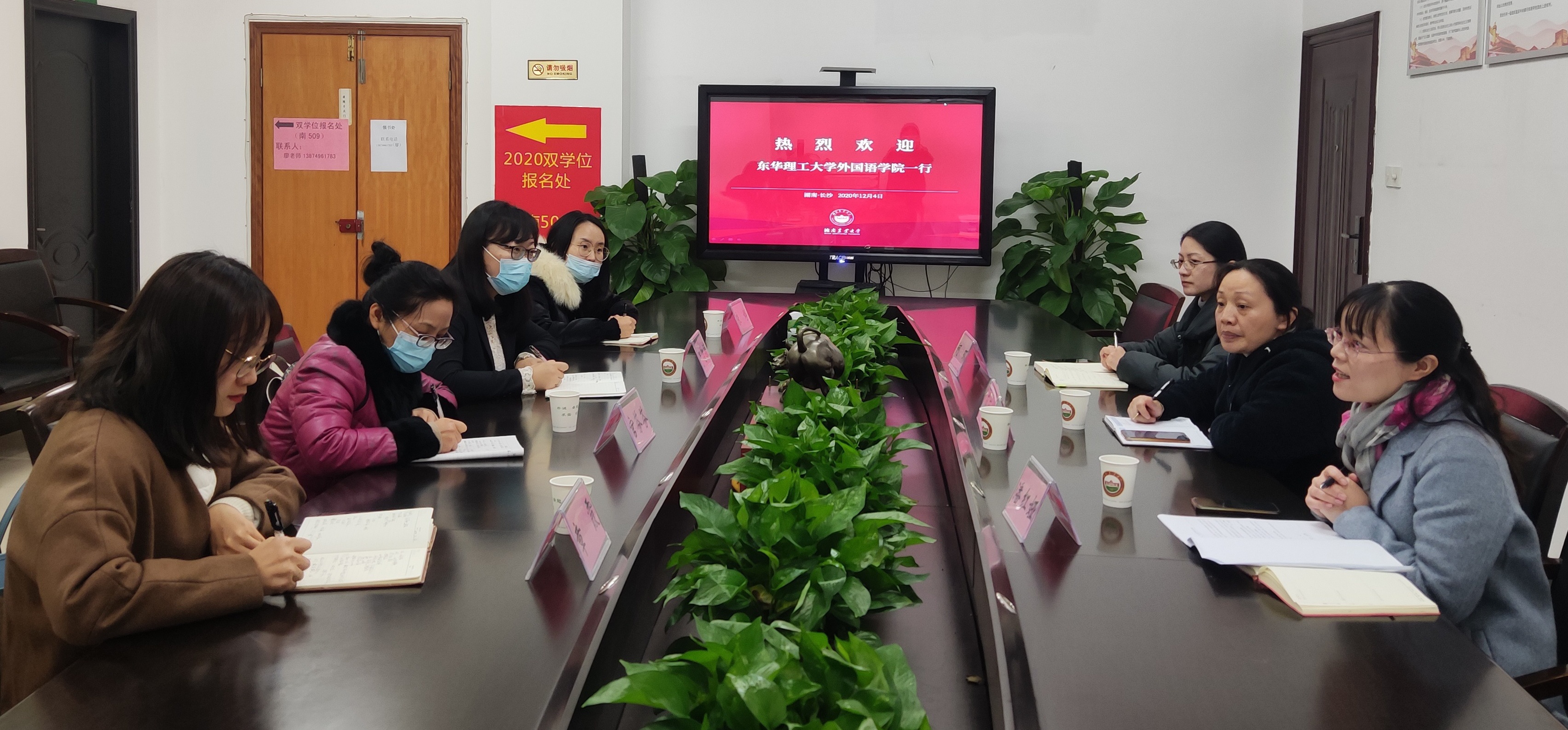 2020年12月4日下午,东华理工大学外国语学院一行四人来我院就外语专业建设、专业实习实践、第二课堂活动开展调研交流。学院范丽群副院长及日语系副主任潘红娅老师、湖南省日本文化研究与交流中心办公室主任何环老师参加了本次交流会议。