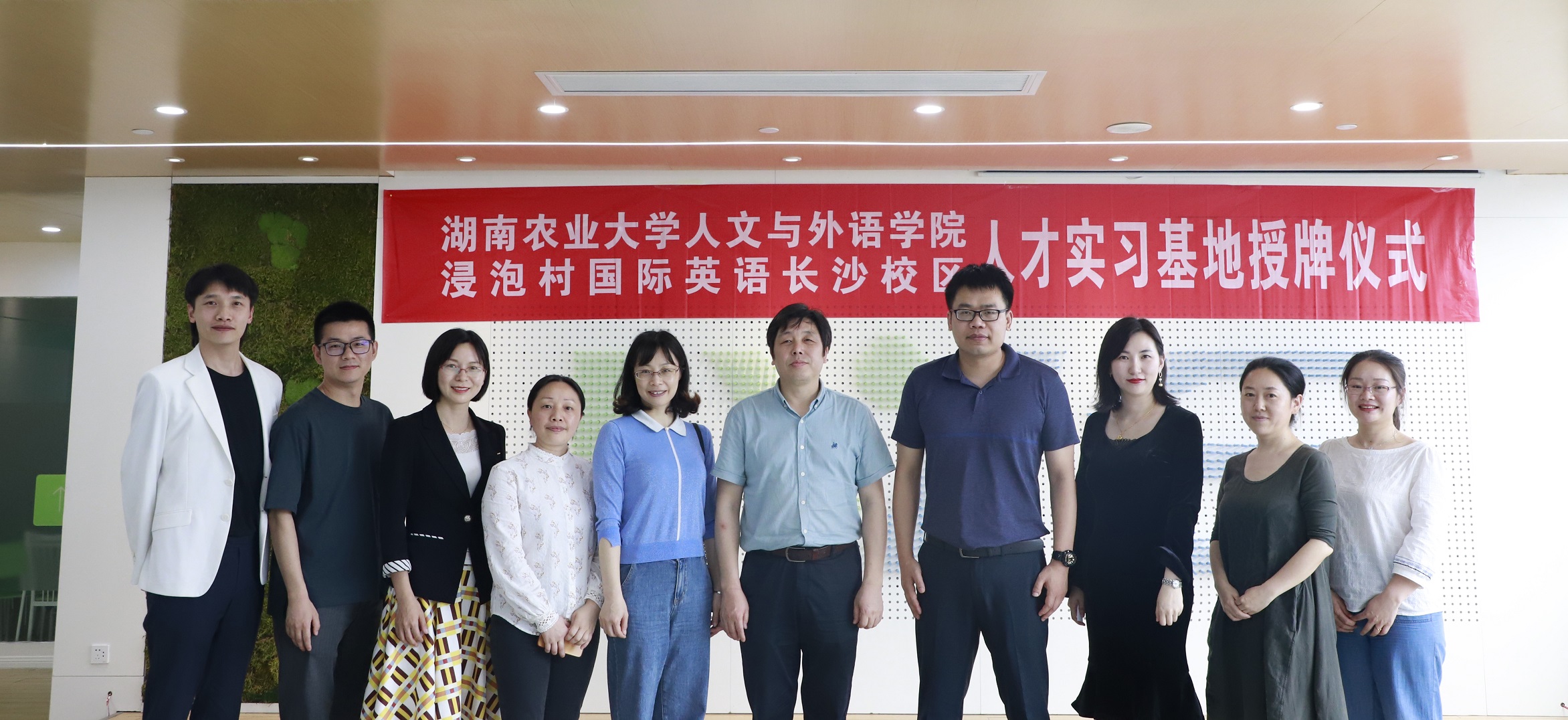 2021年5月12日下午,湖南农业大学人文与外语学院院长胡东平、党委副书记唐琳、副院长范丽群、英语系和教务办老师代表一行前往浸泡村国际英语长沙校区人才实习基地授牌。浸泡村国际英语集团首席运营官兼总裁助理杨阳、营销副总裁王刚、长沙校区校长杨念、人力行政经理刘盈希等代表出席仪式。