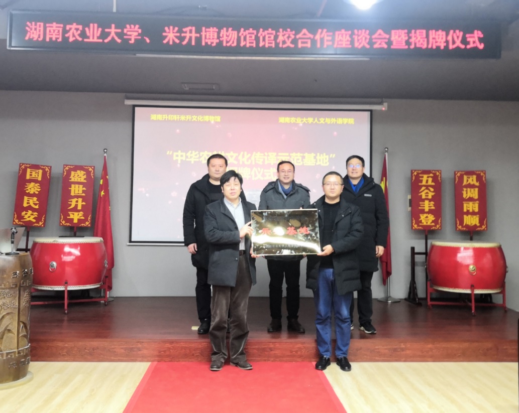 2022年1月24日下午,濛濛细雨中,湖南农业大学吴波副校长带领人文与外语学院党委班子一行来到湖南升印轩米升文化博物馆,举行了湖南农业大学“中华农耕文化传译示范基地”挂牌仪式,并与博物馆就进一步深入推进馆校合作战略进行了深入友好的座谈。米升博物馆理事长杨杰、理事会监事柳中晖、党支部书记李泽锋以及人文与外语学院周丽、陈颖老师等人参加了会谈。