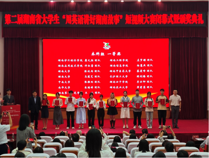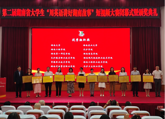 本网讯人文与外语学院范丽群9月24日,第二届湖南省大学生“用英语讲好湖南故事”短视频大赛闭幕式暨颁奖典礼在湖南农业大学圆满落幕。我校推荐的四个作品全部获奖,其中一等奖1项,二等奖3项。湖南省委外事办一级巡视员邱爱华、湖南省委教育工委宣传部部长甘文波、湖南农业大学副校长郑晓峰、高等教育出版社副社长马景焘以及专家组刘正光教授、胡东平教授人文与外语学院院长季红琴教授等近二十位领导专家出席大赛颁奖典礼。