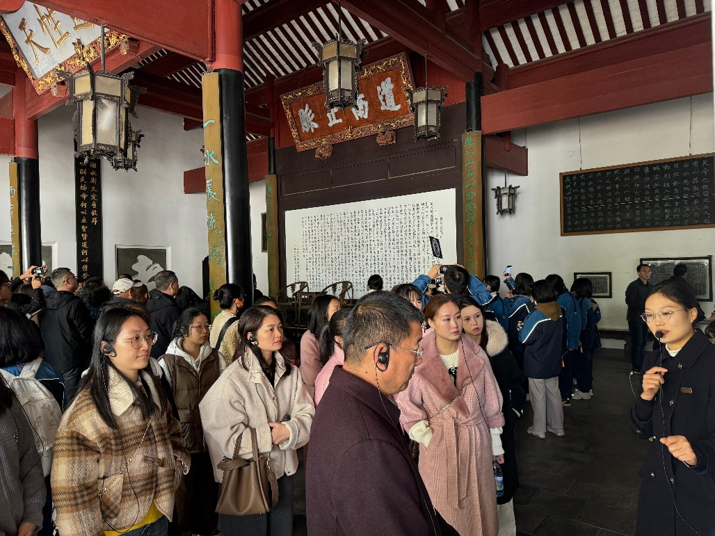 在岳麓书院,全体师生在解说员的带领下,深入了解了书院的历史背景及毛泽东同志在此刻苦求学的故事。岳麓书院作为湖湘文化的瑰宝,其经世致用、心忧天下、立己达人的精神正脉,深深触动了每一位参与者。大家纷纷表示,要深刻领悟“惟楚有材,於斯为盛”的时代内涵,以伟大历史人物的奋斗精神为榜样,汲取科学智慧,为新时代的发展贡献自己的力量。