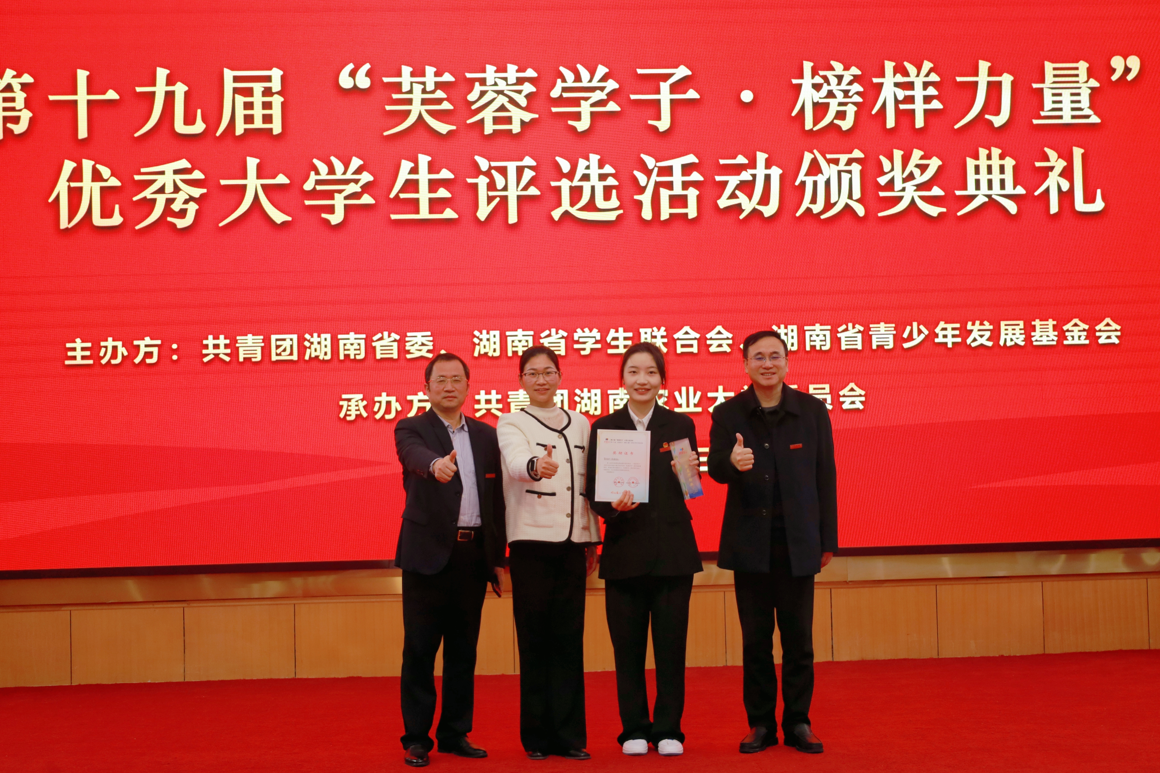 2月26日,第十九届“芙蓉学子·榜样力量”湖南农业大学优秀大学生评选活动颁奖典礼在修业讲堂举行。本次评选活动自启动以来,吸引了全校50余名优秀大学生和20多支优秀团队踊跃报名,经过层层选拔,最终共有10位同学或团队获得第十九届“芙蓉学子·榜样力量”湖南农业大学优秀大学生个人或团队荣誉。学院“青禾传译”志愿服务队荣获湖南省“芙蓉学子·社会公益奖”。