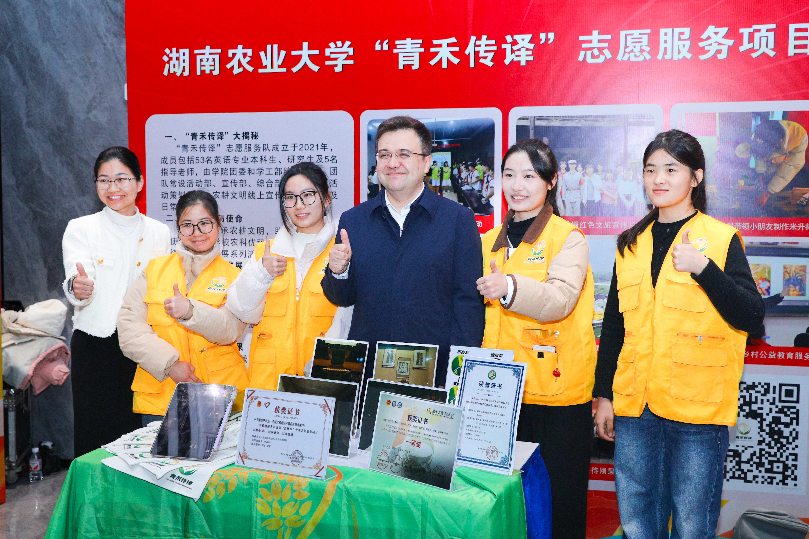 多年来,“青禾传译”志愿服务队坚持“以农为本”,在农耕主题博物馆为布基纳法索、刚果、埃塞俄比亚等国家的国际友人讲述农耕故事和隆平故事,为乡村教育持续提供双语送课下乡服务,为“中非经贸博览会”“农业博览会”等会展提供翻译服务。团队还积极开拓数智时代新型志愿服务模式,创办了“青禾传译”公众号和视频号,发布双语原创推文,制作双语原创视频,提升农耕文明影响力和乡村旅游资源知名度,助力文化传播和乡村振兴。近几年,团队先后荣获第五届“雷锋杯”青年志愿服务项目大赛省级金奖,第六届“雷锋杯”全国铜奖,全国农科高校研究生优秀志愿服务优秀案例二等奖,第十五届“挑战杯”湖南省一等奖,更是连续三年四次获得湖南省教育厅主办的“用英语讲好中国故事”视频大赛省级二等奖。