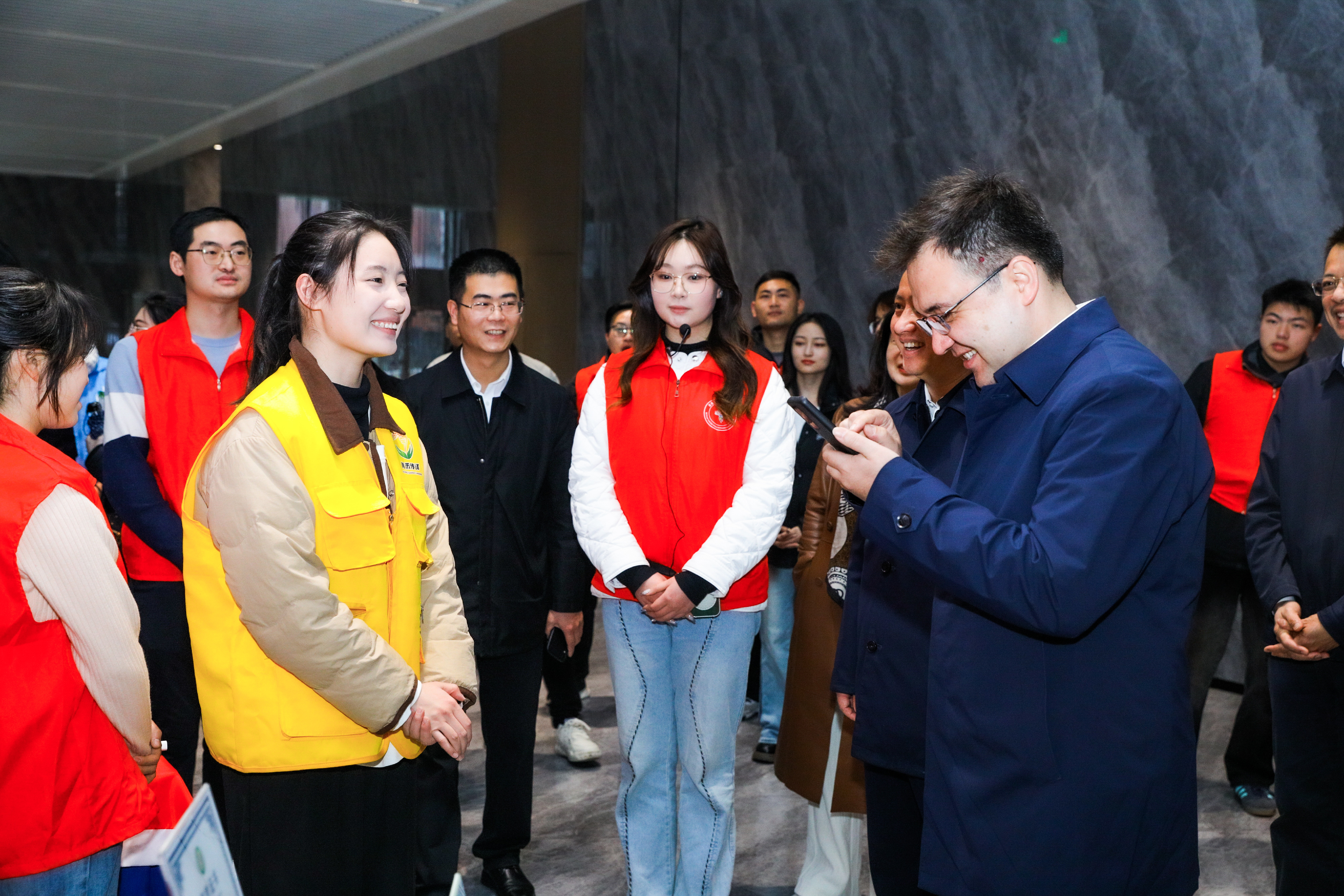 3月3日上午,湖南共青团“雷锋家乡学雷锋”百万青少年志愿服务实践育人行动现场会在湖南省农业科学院岳麓山实验室举行,“青禾传译”志愿服务队作为湖南农业大学唯一一支志愿队参加现场会。在志愿服务深度体验营环节,团中央书记处书记夏帕克提来到“青禾传译”志愿服务队体验展台,认真听取了团队事迹汇报,给予“青禾传译”志愿服务队高度肯定并与团队志愿者合影留念。