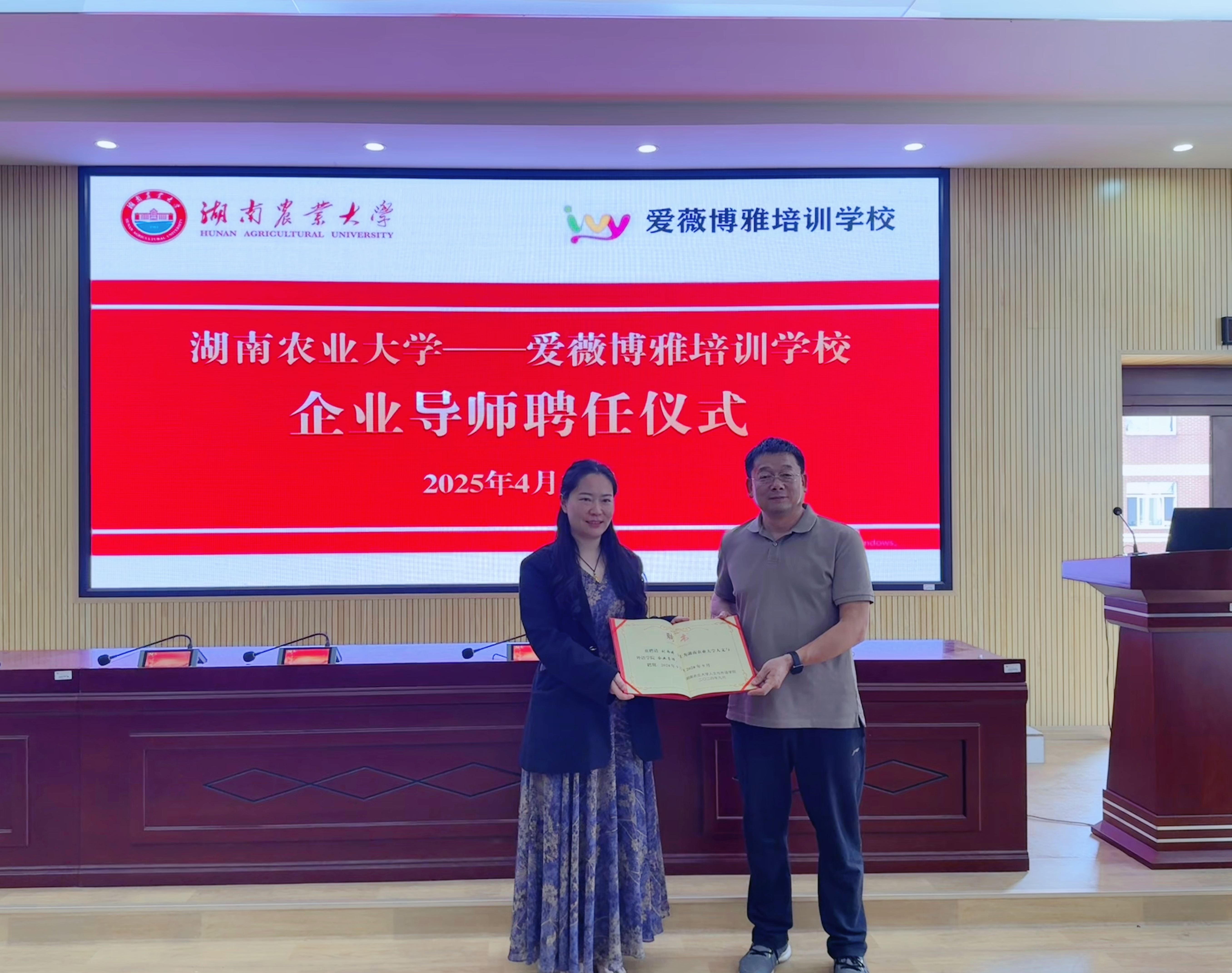 在聘任仪式环节,院党委书记袁光敏为刘雨婷校长颁发聘书,正式启动本年度校企“双导师”协同育人计划。企业导师聘任是学院推动产教融合的重要抓手,通过引入行业专家参与课程设计、实习指导、职业规划等环节,助力学生打通从理论到实践的“最后一公里”。刘雨婷校长表示,将结合培训学校资源优势,在英语教学实训、岗位技能培训等领域与学院开展深度合作,共同培育符合市场需求的复合型外语人才。