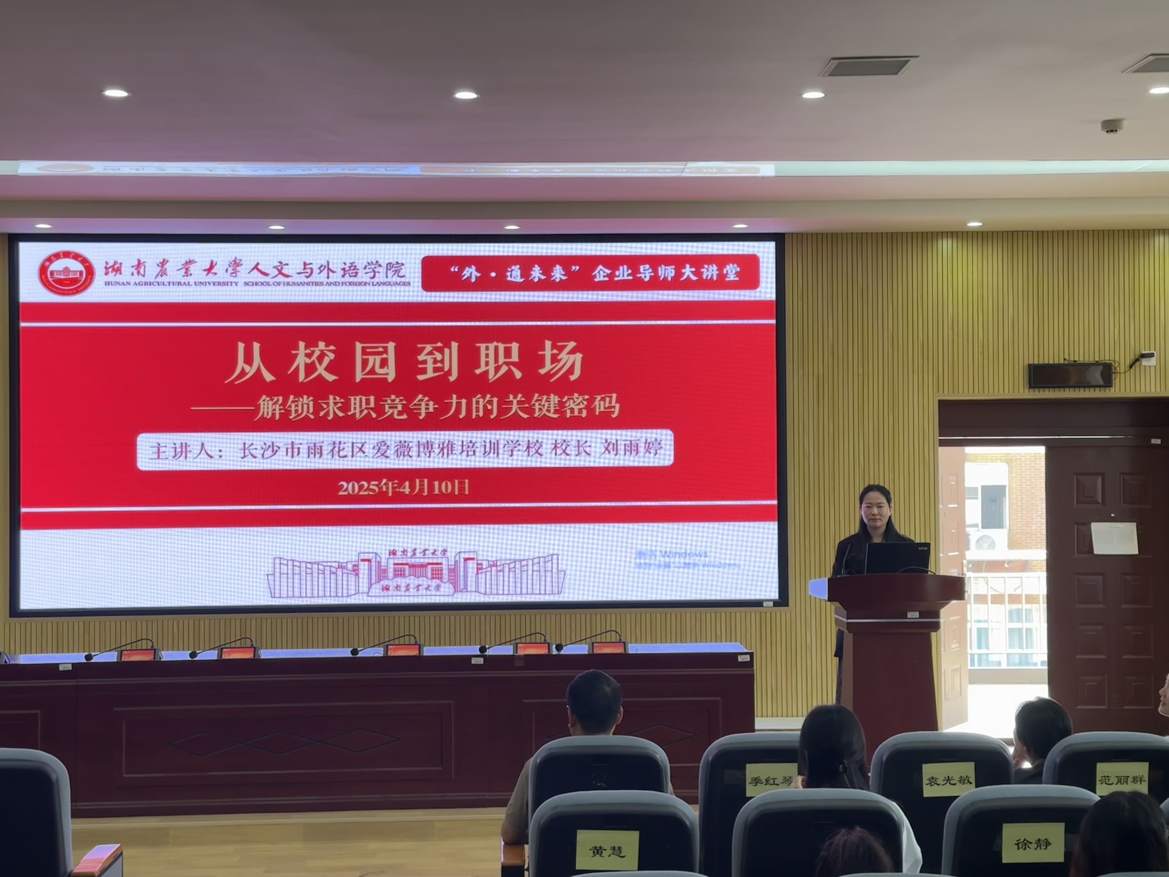 为创新人才培养机制,深化校企协同育人实效,4月10日,人文与外语学院在第九教学楼南502会议室举办“外·通未来”就业指导系列讲座(第一期)与企业导师聘任仪式。长沙市雨花区爱薇博雅培训学校校长刘雨婷受聘为学院企业导师,并担任本期讲座主讲嘉宾。学院党委书记袁光敏、副院长范丽群、副书记刘燕娟及就业专干和百余名研究生、本科生共同参与。