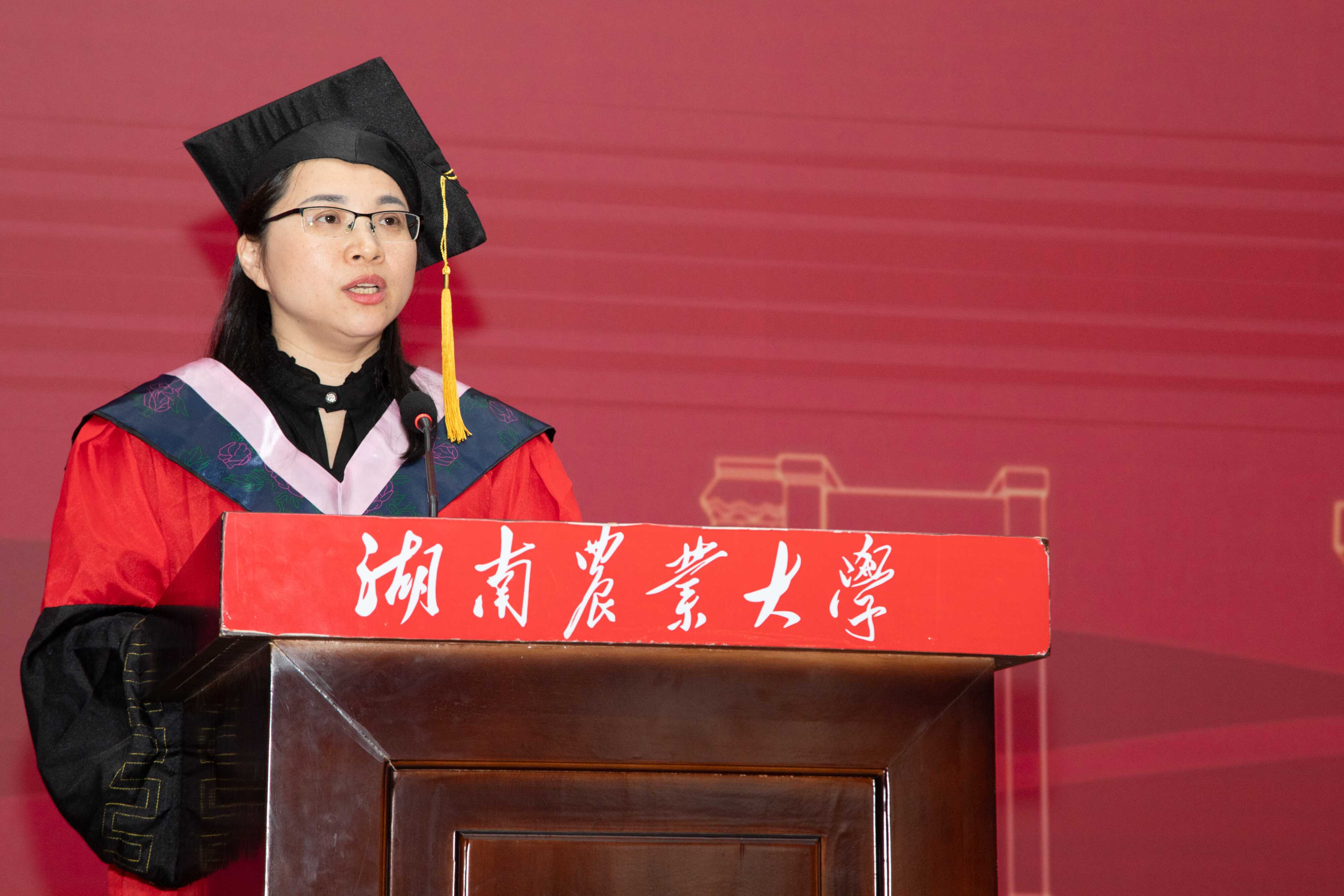 湖南省高校优秀毕业生、2021级英语2班的汤玉桃作为毕业生代表发言。她深情回顾了大学四年校园时光,感恩老师们用渊博的学识为学生打开世界之窗,用严谨的治学态度教会大家求真务实;感恩母校和学院赋予她的全球视野,让自己能在实践中将专业知识转化为职业竞争力;感恩母校,赋予“朴诚、奋勉、求实、创新”精神源泉,成为镌刻在心的箴言和照亮自己求知之路的明灯。