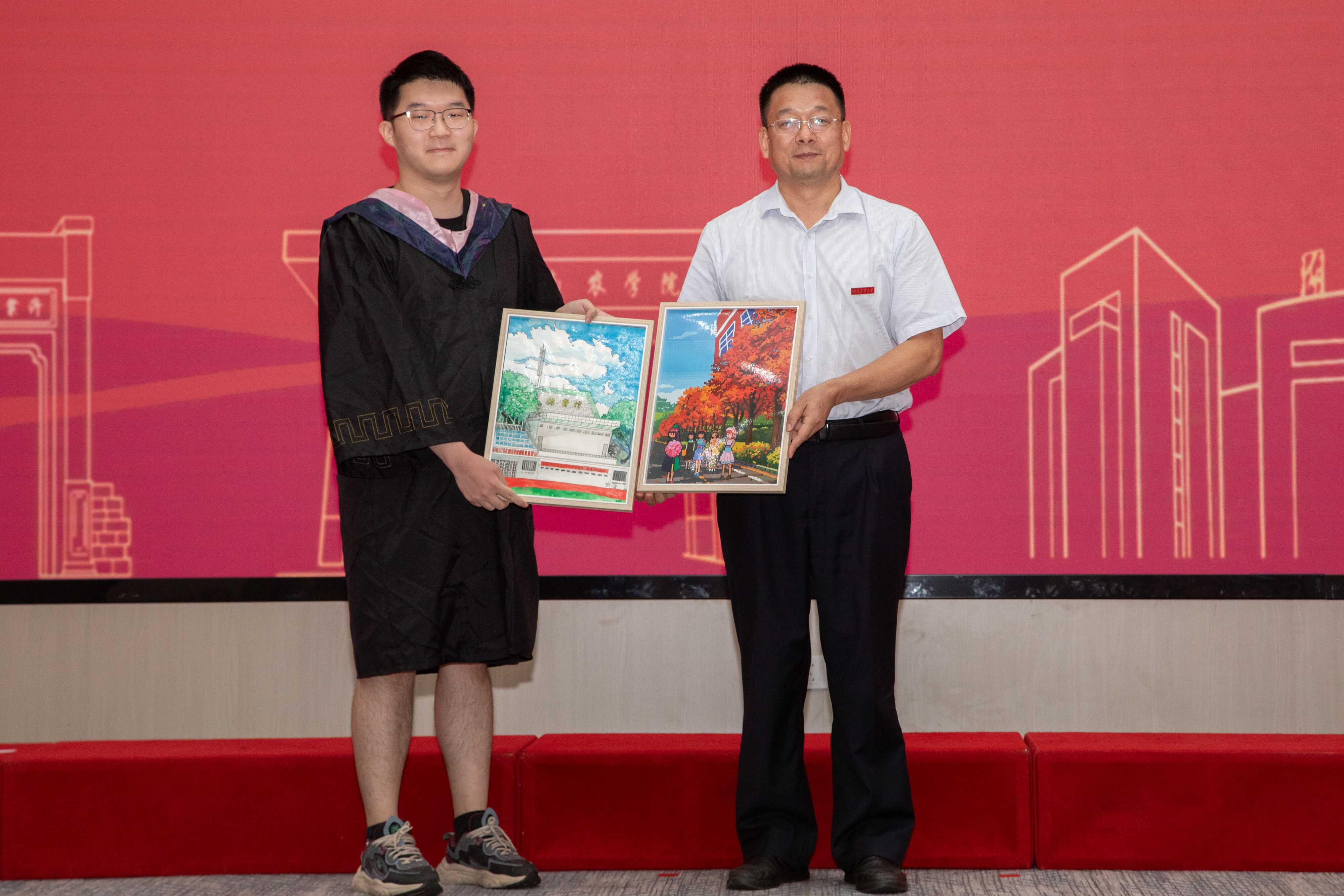 毕业生李振阳向母院赠送纪念品,袁光敏代表学院接受赠礼。两幅手绘的校园美景图表达着学子们对母校的深厚感情和不舍之情。