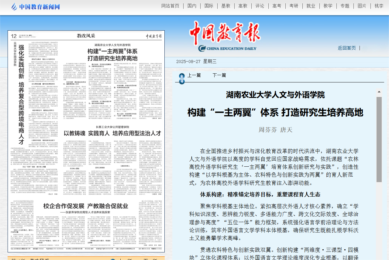 【中国教育报】湖南农业大学人文与外语学院 构建“一主两翼”体系 打造研究生培养高地