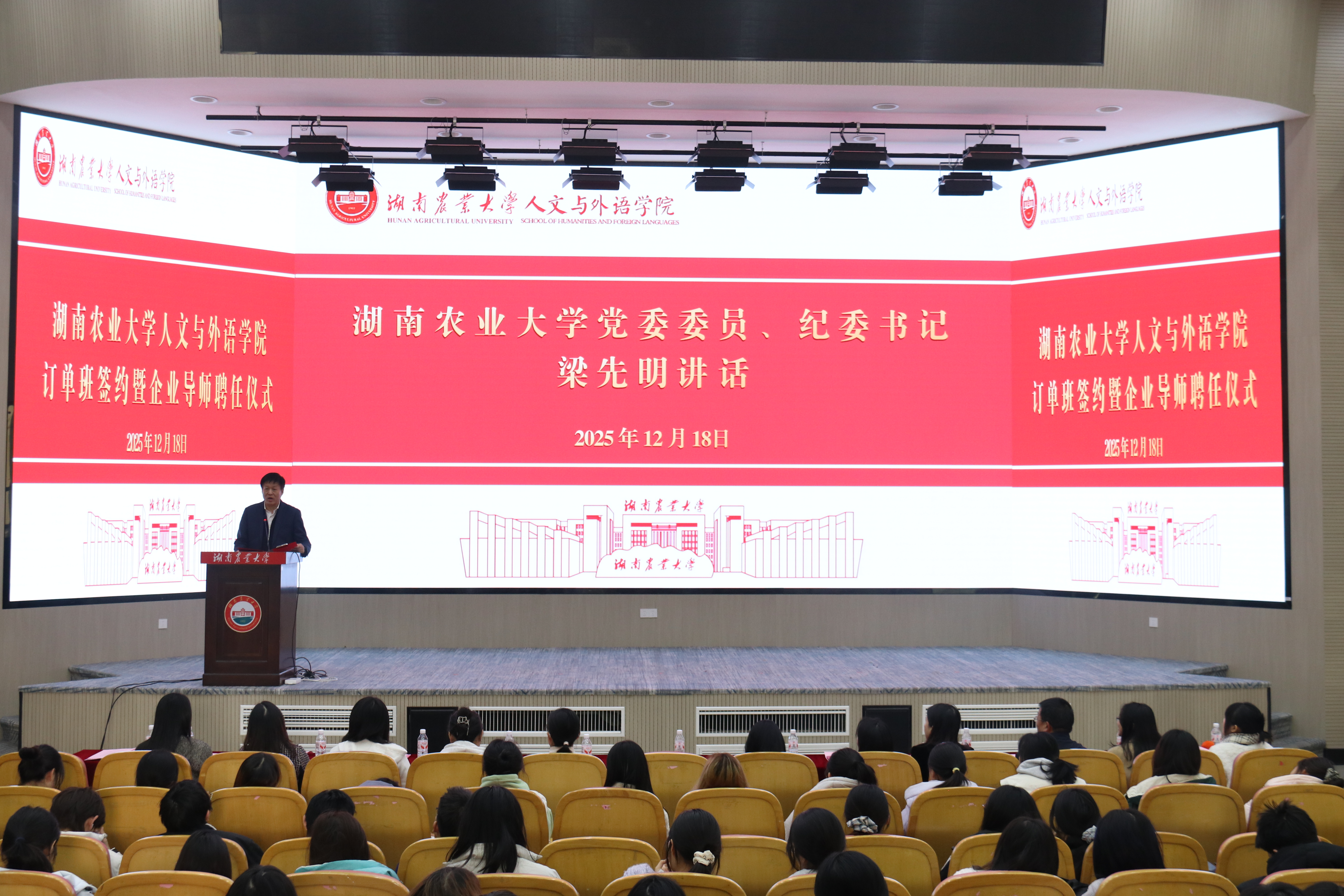 12月18日,人文与外语学院在图书馆大成厅隆重举行校企合作订单班签约仪式、企业导师聘任仪式暨就业创业专题讲座。校党委委员、纪委书记梁先明出席,学院党政领导、企业代表及师生代表300余人参加活动。