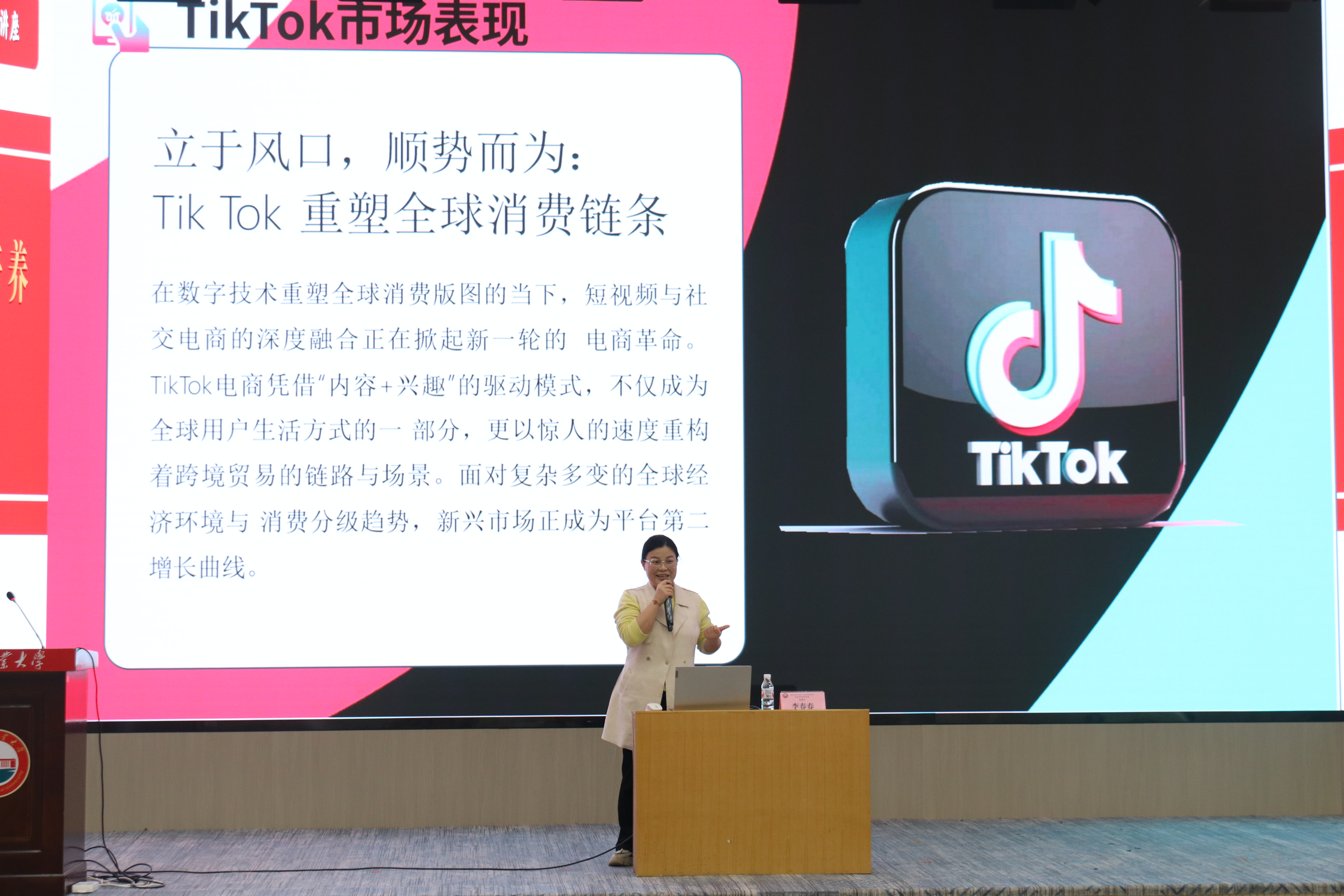 在就业创业专题讲座中,无上荣宠科技有限公司总经理李春春围绕“全球跨境人才市场需求与人才培养”展开分享。她指出,2024年全球电商市场规模已达18.77万亿美元,TikTok作为月活超20亿的平台,已成为内容电商重要阵地。讲座系统阐述了以“好商品、好内容、好服务、好营销”为核心的PEAKS经营方法论,为学校学子揭示了跨境电商的就业前景与能力要求,助力复合型人才培养。