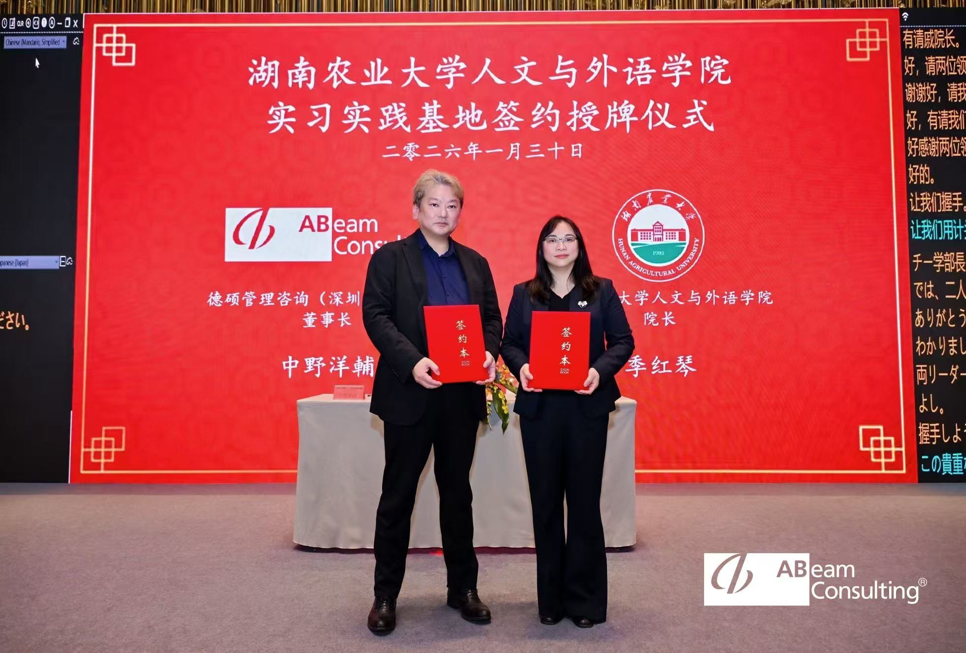 德硕管理咨询(深圳)有限公司成立于2007年,是日本ABeam Systems的独资子公司,以企业管理咨询、计算机软硬件研发、销售及技术进出口业务为主。签约仪式上,季红琴和袁光敏分别与公司董事长中野洋辅先生签署《实习实践基地合作协议》和《毕业生就业基地合作意向书》并授牌。签约仪式上,季红琴介绍了学校的办学历史和日语人才培养的特色,并指出,希望通过与德硕管理咨询有限公司的深度合作,为学生搭建更广阔的实习实践平台,畅通毕业生就业渠道,培养更多适应社会发展需求的高素质应用型人才。