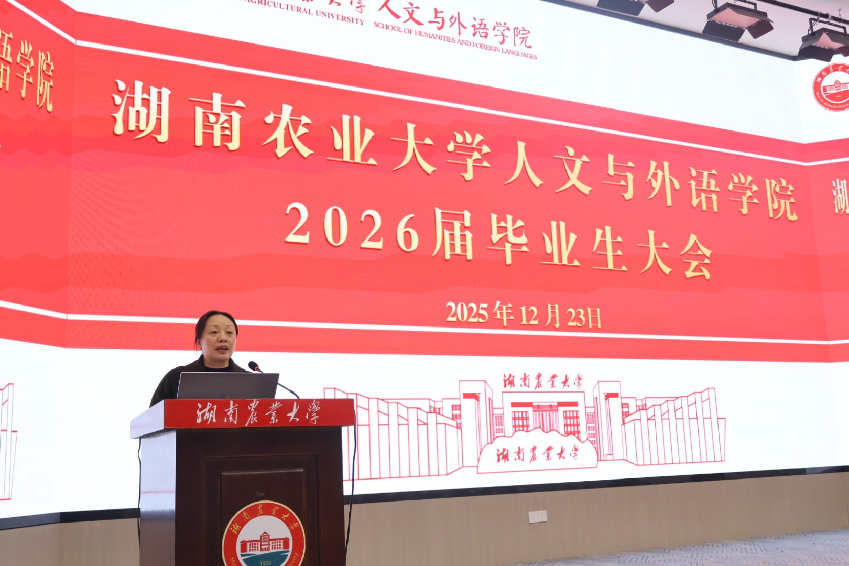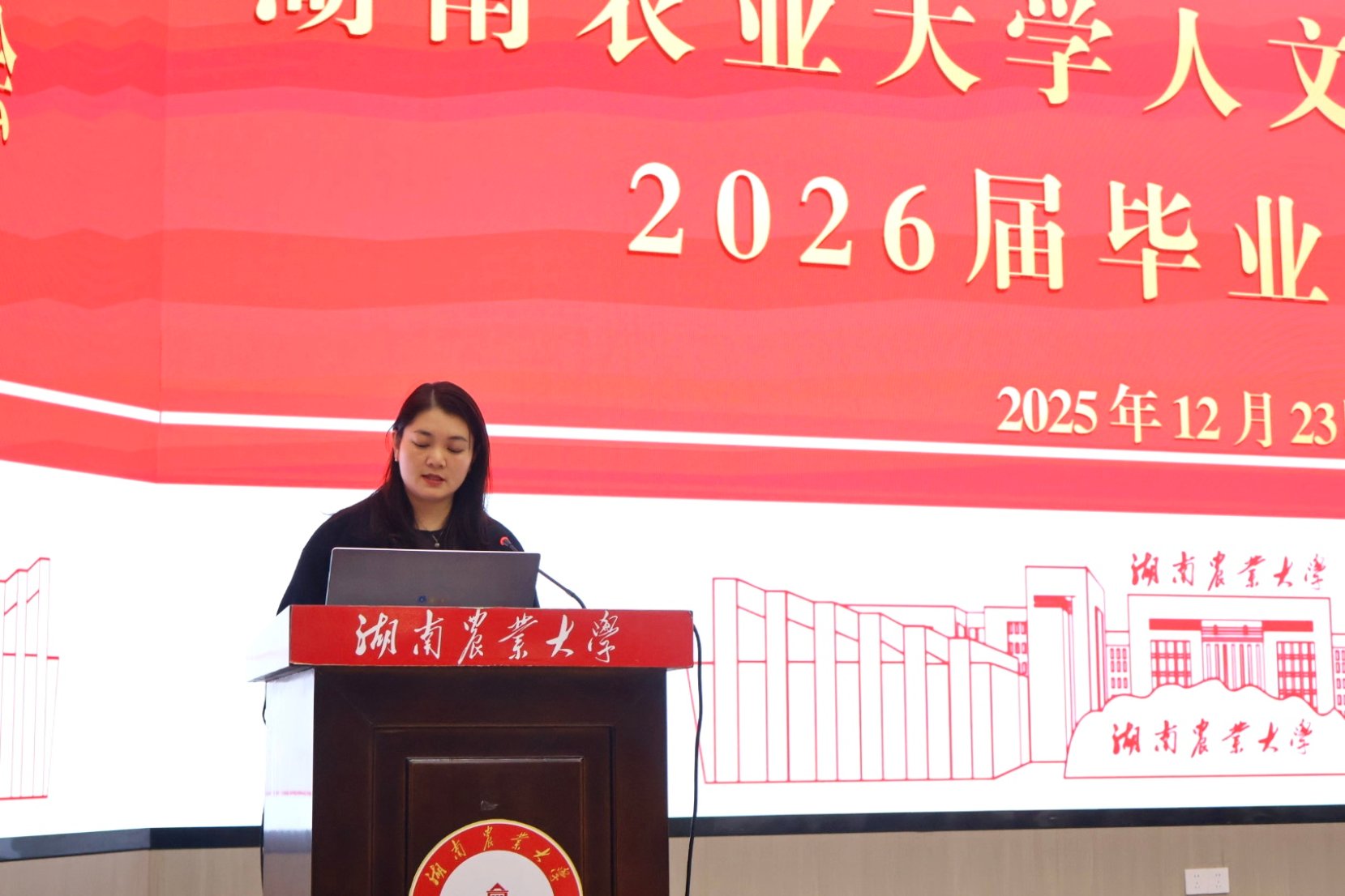 为引导2026届毕业生准确把握毕业实习要求,科学规划实习与就业路径,12月23日上午,人文与外语学院分专业于图书馆大成厅与九教学楼南502报告厅同步召开2026届毕业生实习暨就业动员大会。学院院长季红琴、副院长范丽群、党委副书记兼副院长刘燕娟及日语系负责人、学院相关辅导员老师和2026届全体毕业生参加会议。会议由辅导员甘采博主持。