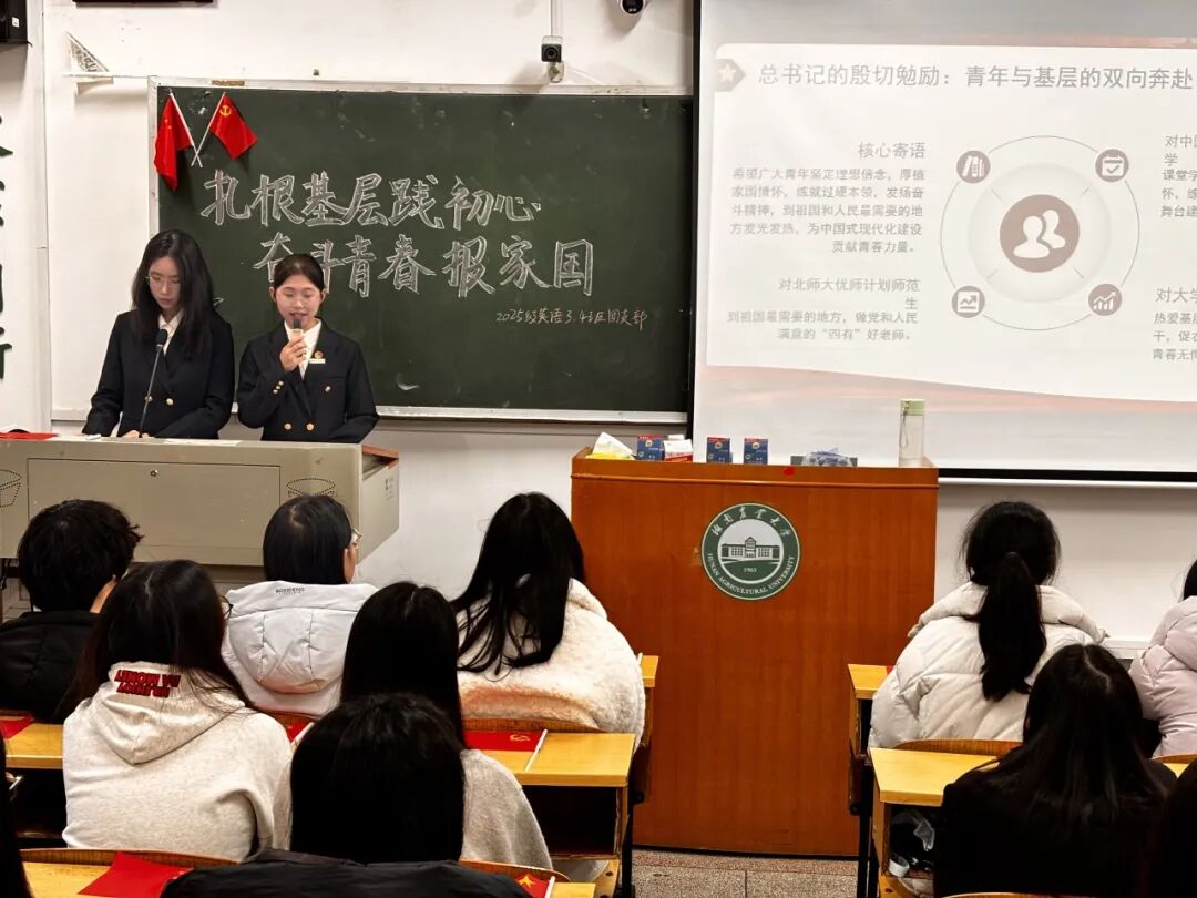 为引导青年学子深刻理解基层工作,3月19日,学院组织2025级学生班级在第七教学楼开展了以“扎根基层践初心,奋斗青春报家国”为主题的青年大学生政治理论学习。通过本次学习,同学们深入了解了基层工作的历史脉络与新时代内涵,进一步领悟了国家引导青年投身基层的政策布局,也让刚步入大学的2025级新生更加坚定将个人理想融入国家发展大局、以青春力量服务人民的信念与决心。