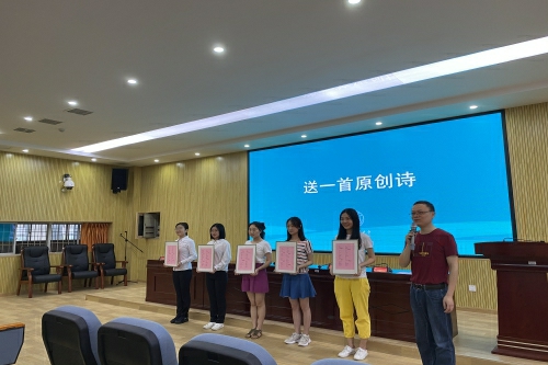 在此离别之际,毕业生班主任龚维国老师根据学生特点,以学生名字为题为每位毕业生写了一首原创诗,希望毕业生带着诗和远方,善待未来的生活,无论前路充满多少困难与挑战,应始终常怀感恩之心,永葆奋斗之情,成为一个对社会、对国家有用的人。希望学弟学妹们存有一份善良,传承向上的力量,书写自己的诗画人生。伴随着优雅的音乐,龚老师深情地朗诵这一首首专属于每一位毕业生的特别的礼物,赢得了同学们的阵阵掌声和潸然而下的泪水。泪水中有对老师辛勤付出和无私奉献的感激,更感动于老师对每一位同学细致入微的观察和对未来的美好憧憬。