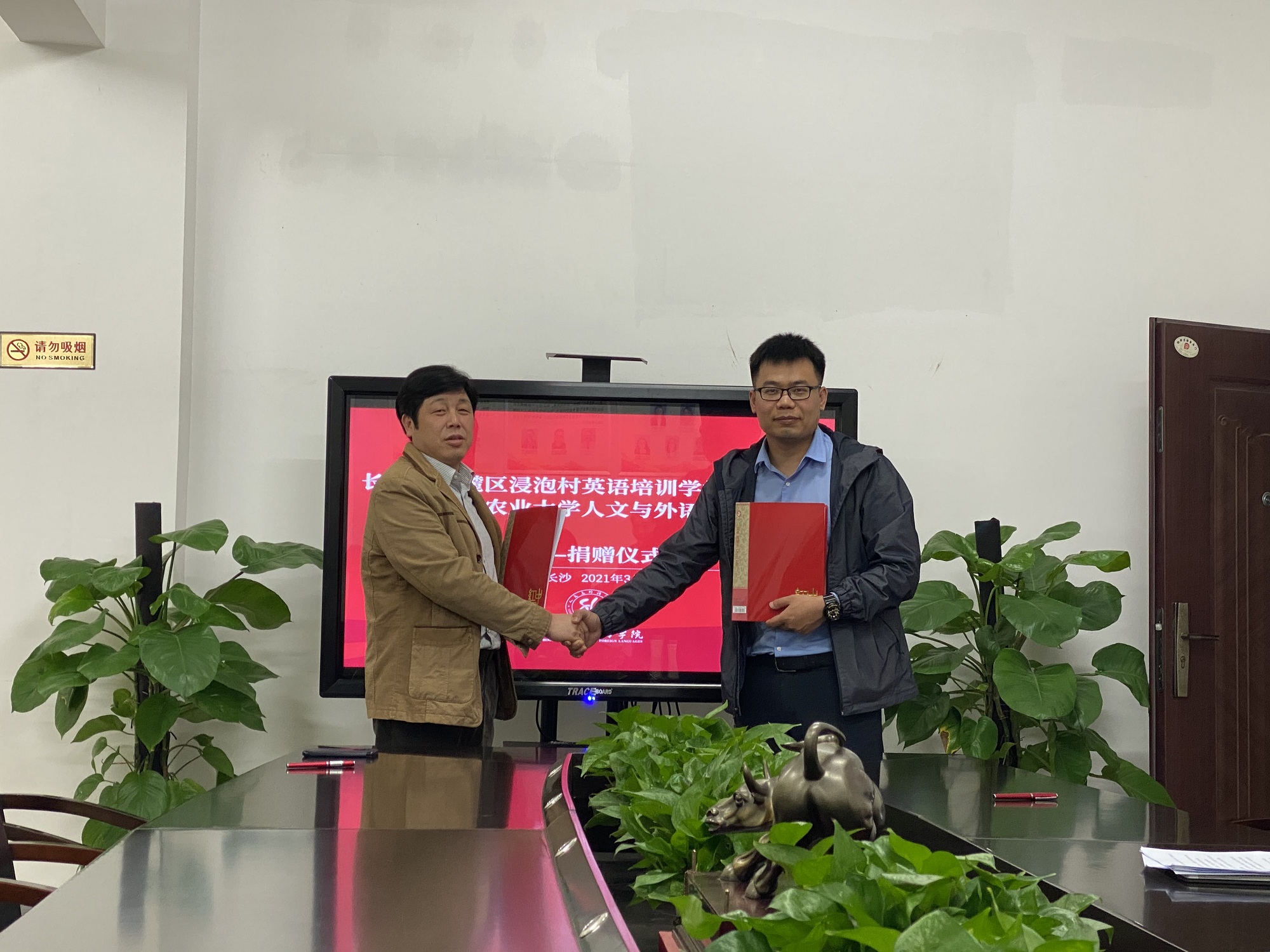 2021年3月30日,长沙市岳麓区浸泡村英语培训学校有限公司向湖南农业大学人文与外语学院捐赠40万元,仪式在湖南农业大学第九教学楼南509室举行。