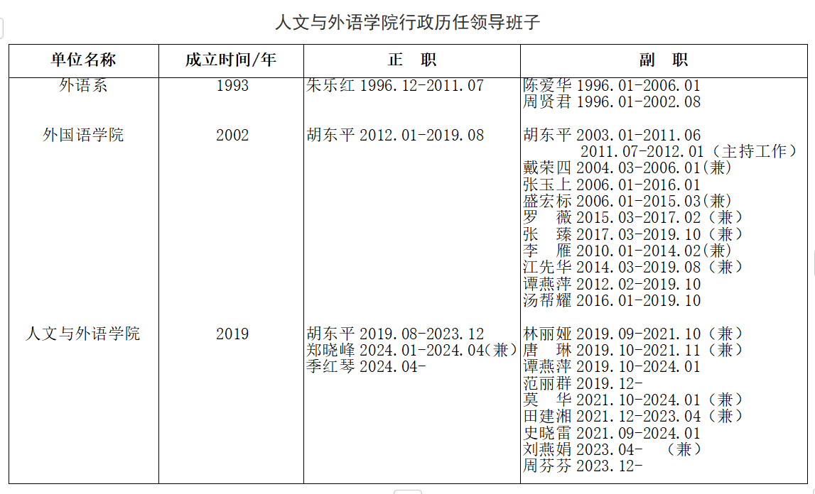 人文与外语学院行政历任领导班子